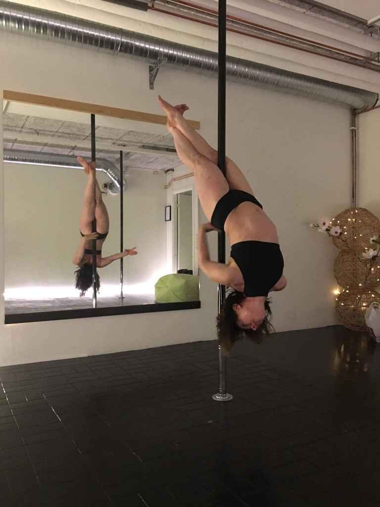 COMBO – INTERMEDIATE This combo is done on static pole. You’ll need a Back hook spin, Invert, Side v Superman and Inverted thigh hold.
