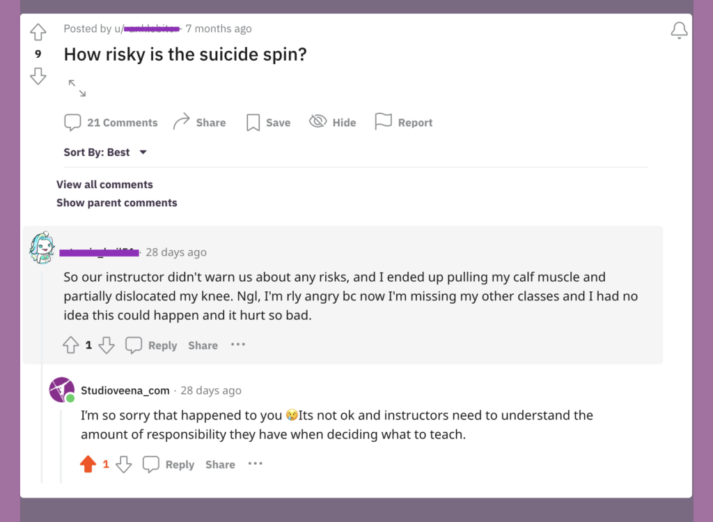 Below is a recent Reddit comment that was added to my reply expressing concern about pulling on the foot instead of taking time to strengthen the legs for a move called the suicide spin. I feel so bad for this person and I hope she’s fully recovered now.